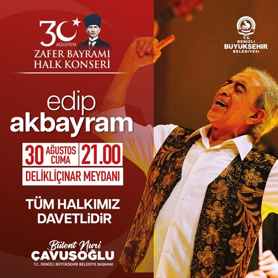 Denizlililer, Zafer Bayramı coşkusunu Büyükşehir Belediyesinin 30 Ağustos Cuma günü Delikliçınar Meydanı’nda saat 21.00’de düzenleyeceği efsane sanatçı Edip Akbayram konseri ile bir başka yaşayacak.
